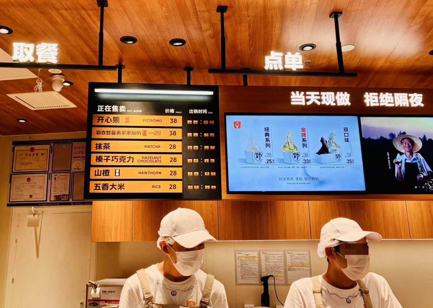 崔渐为向界面新闻表示,野人先生的现制模式是“中央工厂预处理+门店终端制作”的协同,中央工厂将巴氏杀菌后的鲜牛乳制成冷冻奶浆,通过冷链配送至门店,店员需现场进行缓化解冻,再加入新鲜水果、坚果等配料,通过专用冰淇淋机极速凝冻完成从浆料到冰淇淋的制作。