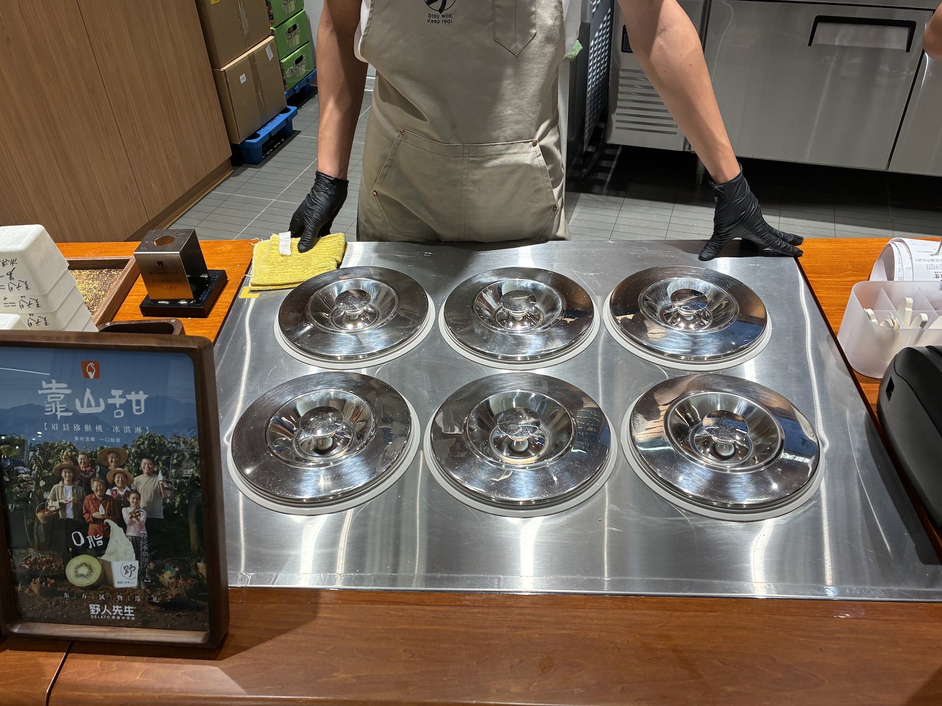 “我们在门店其实一直在宣传现制,员工现场给水果削皮、焖米饭,冰淇淋出锅时间表都写在大屏幕上了,我们尽可能在门店向顾客展示野人先生的现做模式,包括‘分时段售卖、只做几个单品’也正是囿于门店现做这一模式。”他说。